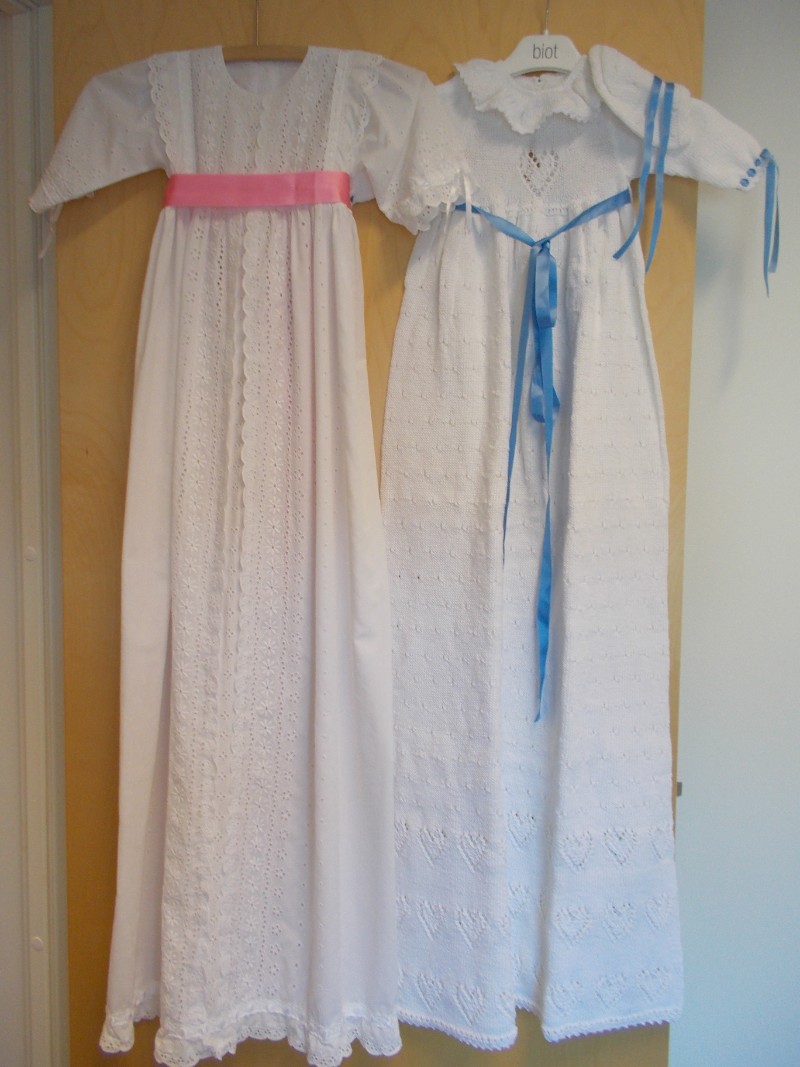 De kan låna dåpskjole på kyrkjekontoret. Det er to dåpekjolar til utlån: Den med rosa band er ei gåve frå Sand sanitetsforeining (er ogås blå band til kjolen). Den strikka kjolen er ei gåve frå Brita Erøy i Erfjord.
